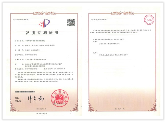 隨著科技進步與技術創(chuàng)新不斷發(fā)展,自主知識產權儲備,尤其是創(chuàng)造性較高的發(fā)明專利已成為企業(yè)發(fā)展的核心競爭力。近日,廣東匯興精工智造股份有限公司(股票代碼:839258)又新增一項發(fā)明專利——《一種陶瓷馬桶自動存胚輸送線》。