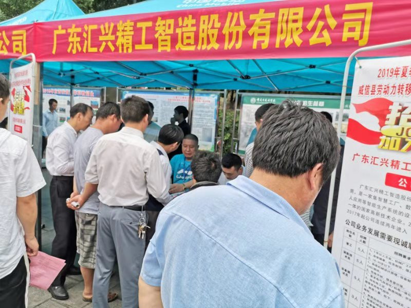 由威信縣委、縣政府,東莞市大嶺山鎮(zhèn)黨委、政府主辦,威信縣人社局、東莞市大嶺山鎮(zhèn)人社分局承辦的“2019年夏季東莞市大嶺山鎮(zhèn)對口幫扶威信縣農村勞動力轉移就業(yè)專場招聘會”在云南威信縣體育館廣場隆重舉行。此次招聘會有來自廣東省大嶺山鎮(zhèn)的名優(yōu)企業(yè)10余家,大嶺山鎮(zhèn)提供就業(yè)崗位500余個。招聘會現(xiàn)場氣氛熱烈,其中匯興智造集團招聘位置前排成長長的隊伍,應聘者禮貌有序地排隊填寫應聘表。